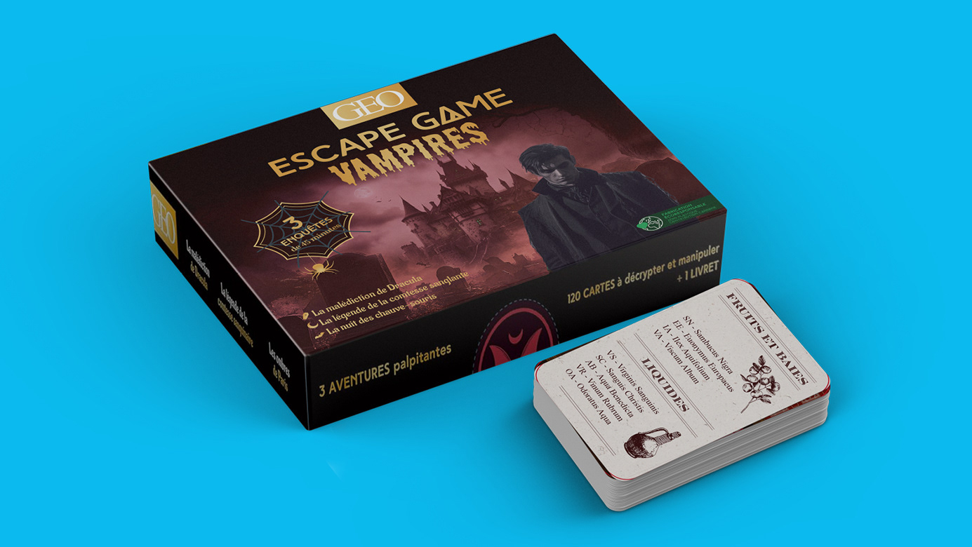 Maquette et illustration de 2 escape games composés de 200 cartes d'énigmes et d'un livret scénario.