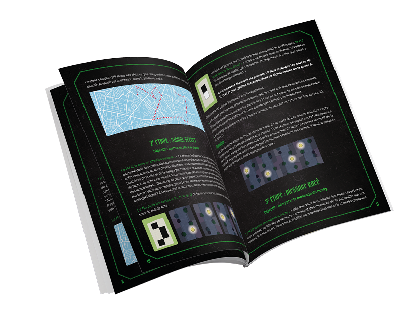 Maquette et composition des illustrations d'un escape game composé de 200 cartes d'énigmes et d'un livret scénario.